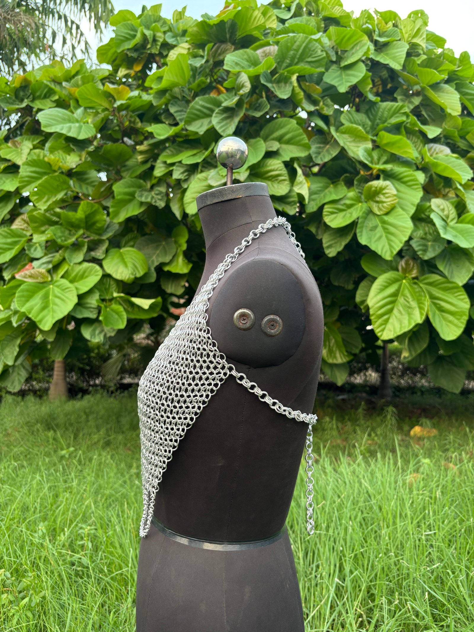 : Step into the world of fantasy and medieval elegance with this handcrafted aluminum chainmail halter top. Designed in a classic 4-in-1 European weave, this lightweight yet durable top adds a bold, authentic touch to your cosplay, LARP, or renaissance outfit.