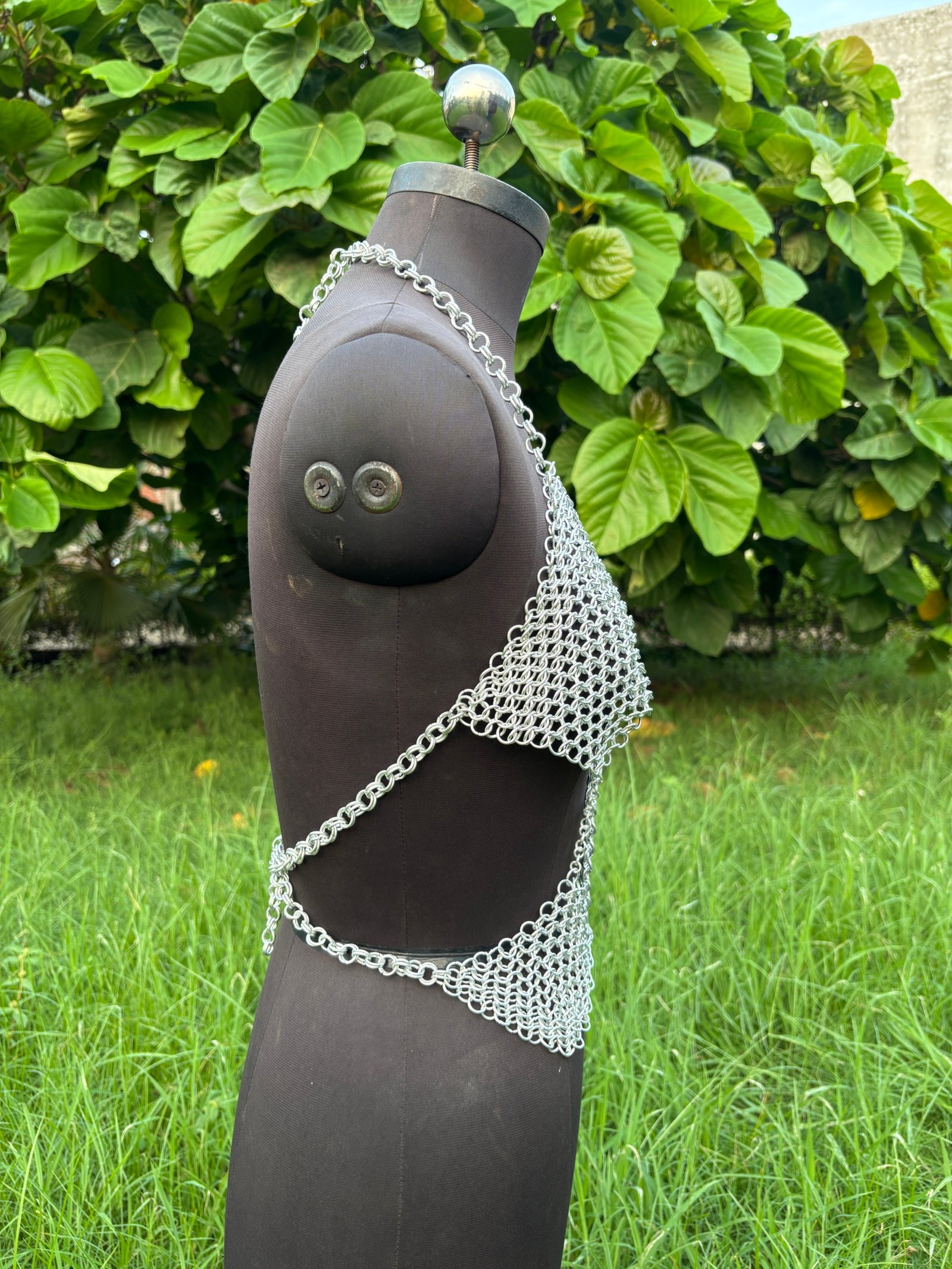 : Handmade geometric chainmail top for women, featuring bold cutouts, O-ring details, and a halter neckline. Perfect for festival outfits, cosplay, larp, renaissance faire. Every piece is made by hand, ensuring attention to detail and artisanal quality.